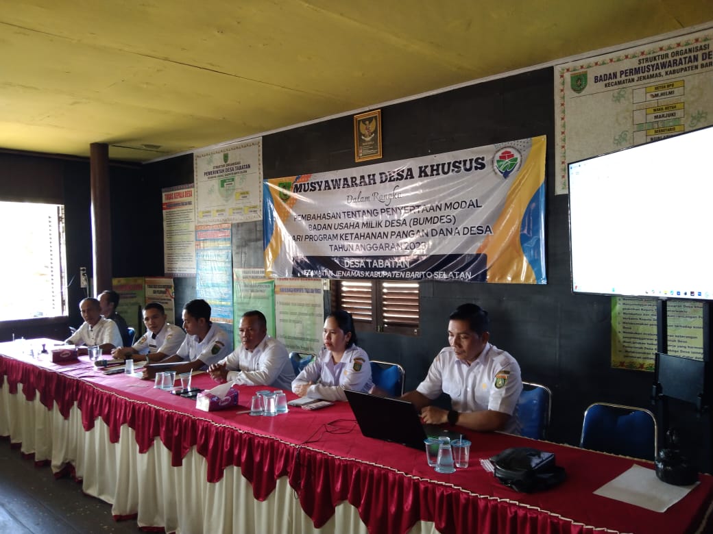 Kepala Desa Tabatan Bapak Mahmudin, yang sekaligus membuka dan memimpin jalannya musyawarah, Perwakilan dari Kecamatan Jenamas, Ketua dan anggota Badan Permusyawaratan Desa (BPD), Perangkat desa dan staf sekretariat desa, Pengurus BUMDes Tabatan, Pendamping desa dan tenaga ahli pemberdayaan masyarakat, Tokoh masyarakat, tokoh Adat Dayak, Ketua RT/RW se-Desa Tabatan, Serta perwakilan kelompok tani, kelompok peternak, dan pelaku UMKM lokal.