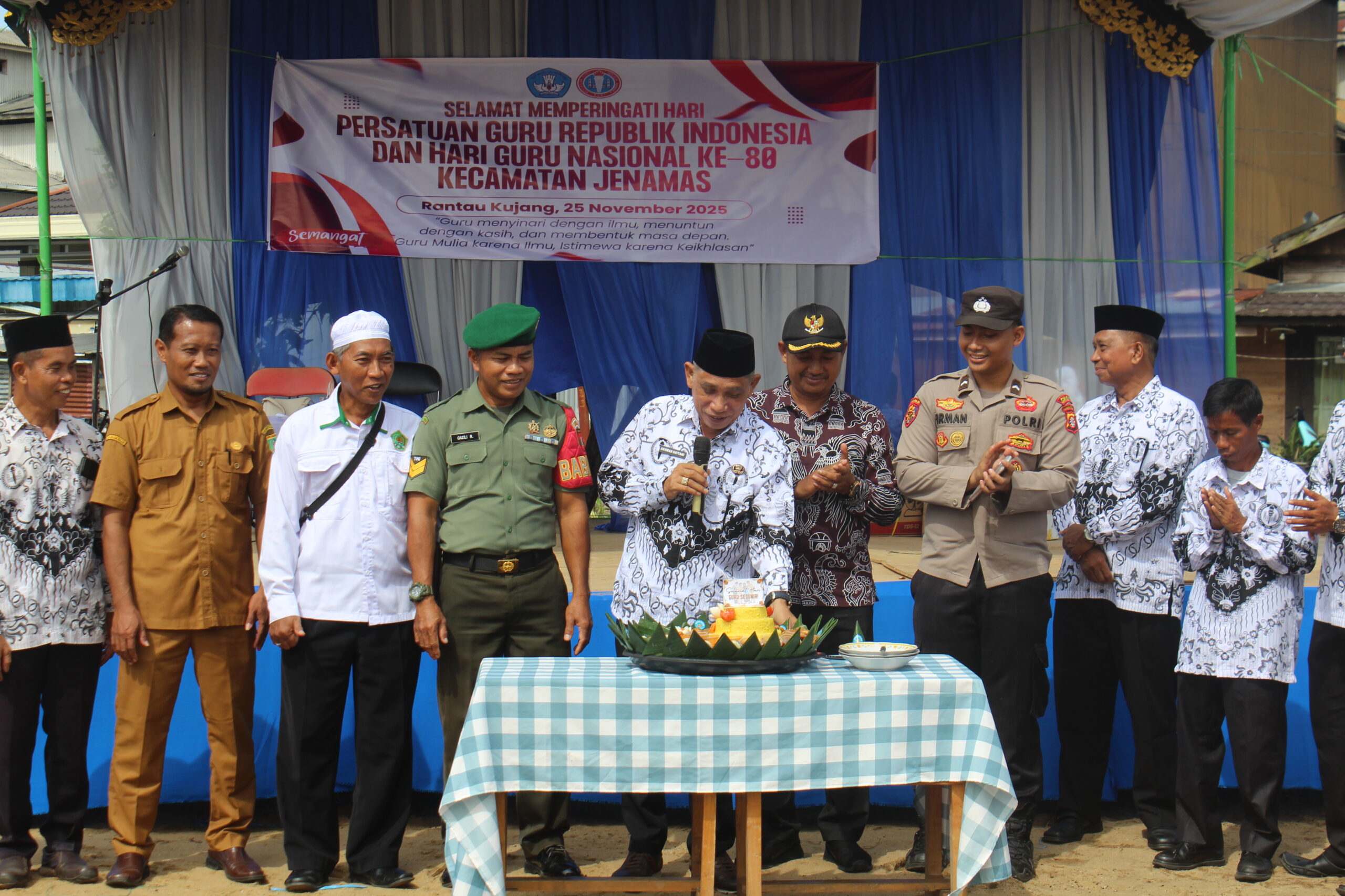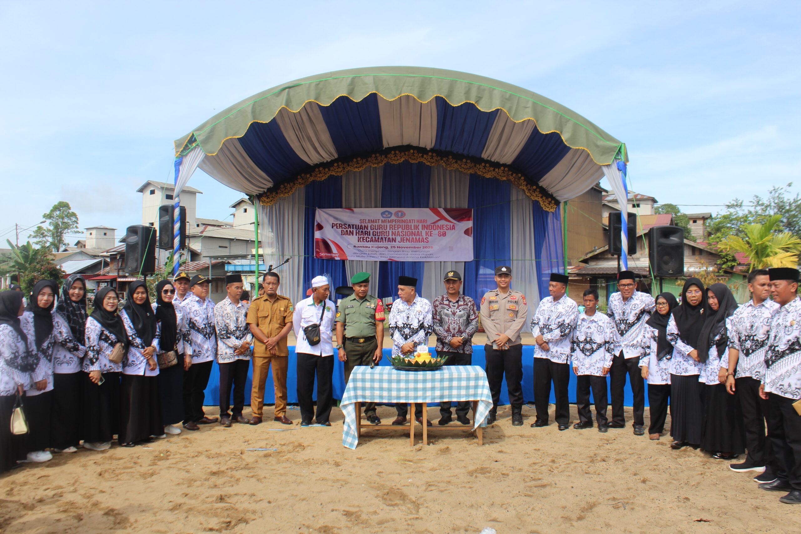 Rantau Kujang – Peringatan Hari Guru Nasional (HGN) Ke-80 tahun 2025 di wilayah Kecamatan Jenamas berlangsung khidmat, meriah, dan penuh apresiasi terhadap dedikasi para pendidik. Kegiatan ini dipusatkan di halaman Kantor Kecamatan Jenamas dan diikuti oleh para guru dari jenjang PAUD, SD, SMP, hingga SMA se-Kecamatan Jenamas, serta perwakilan siswa, komite sekolah, dan unsur muspika.